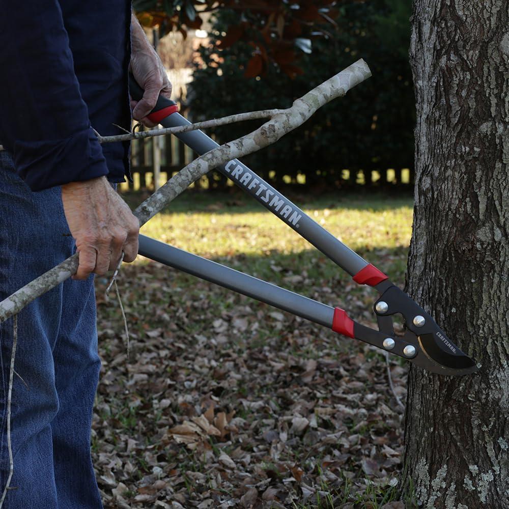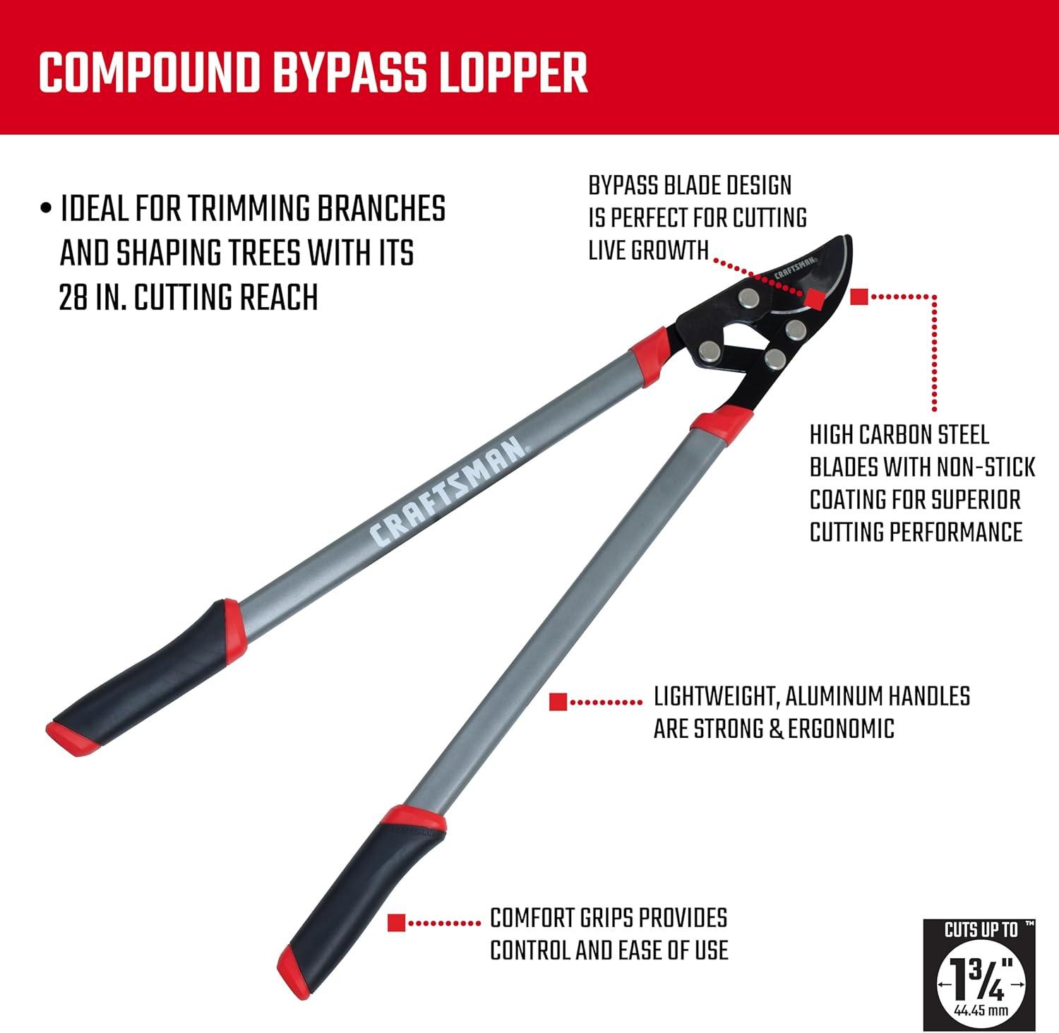 The Craftsman 24-Inch Carbon Steel Compound Bypass Lopper is a go-to for any trimming, shaping, and pruning needs. It has a long handle to reach ticky to get to areas. The clean cutting blades make cutting through thicker branches easy. reat for trimming and shaping trees and bushes with its long reach and clean cutting blades. The high-carbon steel blades with non-stick coating provides superior cutting performance. It has strong, yet lightweight, aluminum handles to reduce fatigue.